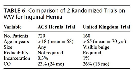 “Annually, more than 20 million inguinal herniorrhaphies are performed worldwide, and it is one of the most common operations performed by general surgeons. Up to one third of patients with inguinal hernias are asymptomatic or minimally symptomatic at the time of presentation. Historically, surgeons have recommended repair of an inguinal hernia at diagnosis even if minimally symptomatic to avoid a hernia accident, which is defined as a bowel obstruction caused by the hernia or strangulation of the contents of the hernia, or both. However, on the basis of the results of 2 recent randomized clinical trials (RCTs), one conducted in the United Kingdom and the other in North America, watchful waiting (WW) has now become an accepted alternative to routine repair. In 2011, the longer-term results of the United Kingdom trial were published. Using Kaplan-Meier analysis, 72% of patients were predicted to crossover (CO) from WW to surgery by 7.5 years causing the authors to conclude that routine repair should be recommended for minimally symptomatic patients without medical contraindications to surgery.”