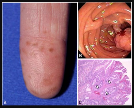 Figure 3. Characteristic features of Peutz-Jeghers syndrome. A, Melanontic macules (“spots”) on the tips of the fingers of an adult patient. B, A large polyp on a thick stalk in the duodenum. When seen, the diagnosis is almost always Peutz-Jeghers syndrome. C, Photomicrograph of a polyp from a patient with Peutz-Jeghers syndrome (hematoxylin-eosin, original magnification × 10). Note fibers of smooth muscle arborizing through the polyp (arrows). All large Peutz-Jeghers syndrome polyps have this finding, but it may not be mentioned in pathology reports. (Samadder, et al., 2019)