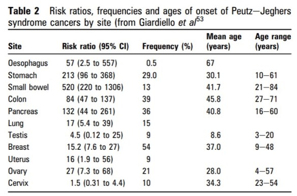 Beggs AD, et al. Peutz-Jeghers syndrome: a systematic review and recommendations for management. Gut. 2010 Jul;59(7):975-86.
