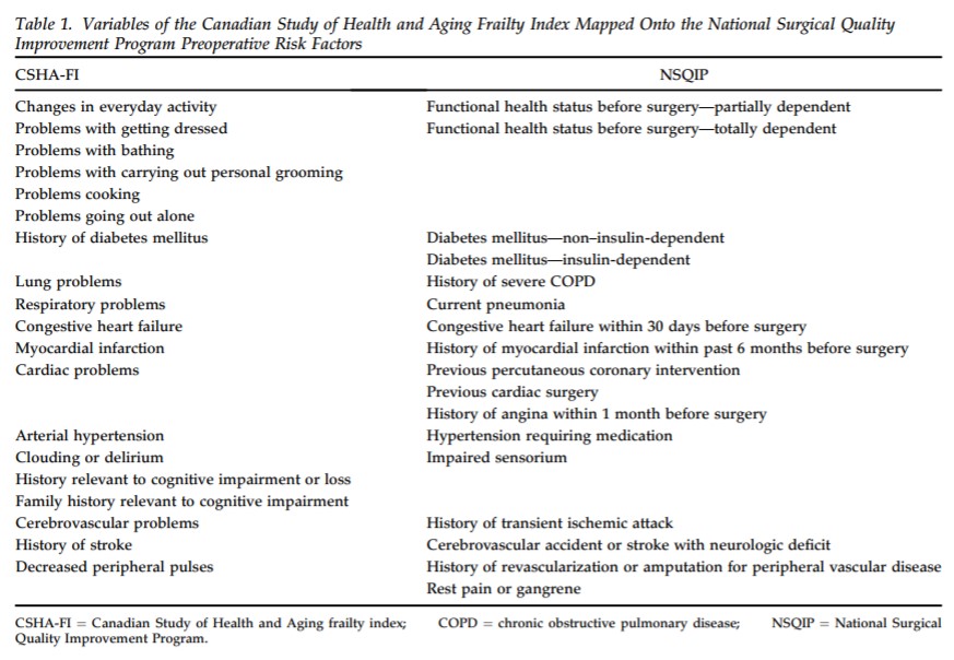 Results: A total of 2,095 patients were included in the analysis. Higher frailty scores were associated with a statistically significant increase in morbidity and mortality. A frailty score of 0, 1, 2, 3, 4, and 5 had associated morbidity rates of 17.9% (142 of 795 patients), 25.1% (178 of 710 patients), 31.4% (126 of 401 patients), 34.4% (48 of 140 patients), 44.4% (16 of 36 patients), and 61.5% (8 of 13 patients), respectively. A frailty score of 0, 1, 2, 3, 4, and 5 had associated mortality rates of 1.8% (14 of 795 patients), 3.8% (27 of 710 patients), 4% (16 of 401 patients), 7.1% (10 of 140 patients), 8.3% (3 of 36 patients), and 23.1% (3 of 13 patients), respectively. When using multivariate logistic regression for mortality comparing age, functional status, prealbumin, emergency surgery, wound class, American Society of Anesthesiologists score, and sex, only age and frailty were statistically significant. The odds ratio was 31.84 for frailty (p = 0.015) and 1.05 (p = 0.001) for age.