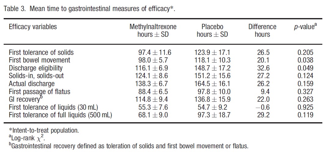 Conclusions: In this study, intravenous methylnaltrexone significantly decreased time to postoperative bowel recovery and eligibility for hospital discharge by ∼1 d, with an adverse event profile similar to placebo. These were two of several exploratory endpoints; not all efficacy endpoints showed a significant difference between methylnaltrexone and placebo. The efficacy results in this trial were not seen in two subsequent large-scale studies.