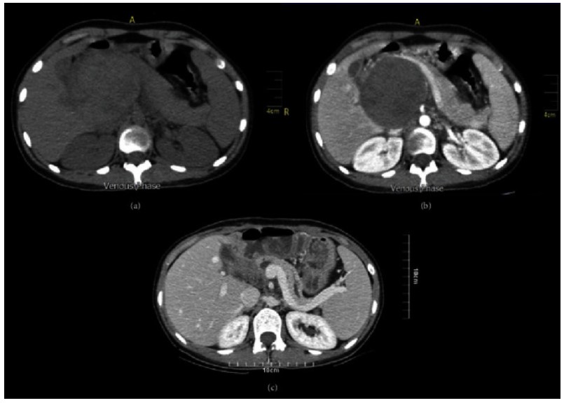 - Large lesions have mixed solid – cystic components showing early weak enhancement with gradual increase in enhancement in the hepatic venous phase.
