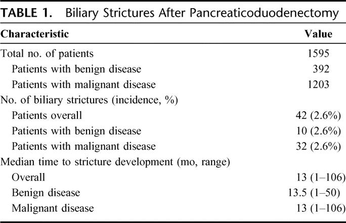 “Between January 1995 and April 2003, 1595 patients underwent PD for periampullary disease (392 benign, 1203 malignant). A retrospective analysis of a prospectively collected database was performed to determine the incidence of biliary stricture after PD.”