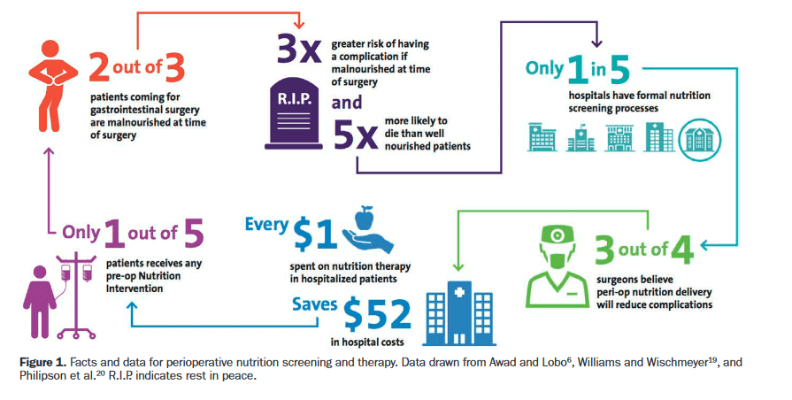 “Malnourished surgical patients have significantly higher postoperative mortality, morbidity, length of stay (LOS), readmission rates, and increased hospital costs.It is estimated that 24%–65% of patients undergoing surgery are at nutrition risk. Additionally, recent prospective observational data indicate that undernourished patients or patients at risk of malnutrition are twice as likely to be readmitted within 30 days after elective colorectal surgery.”