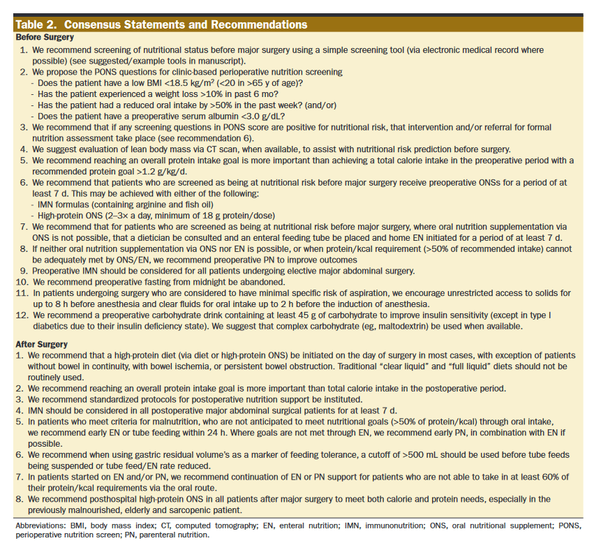 Wischmeyer, Paul E. MD, EDIC*;et al American Society for Enhanced Recovery and Perioperative Quality Initiative Joint Consensus Statement on Nutrition Screening and Therapy Within a Surgical Enhanced Recovery Pathway. Anesthesia & Analgesia 126(6):p 1883-1895, June 2018. Free Full Text