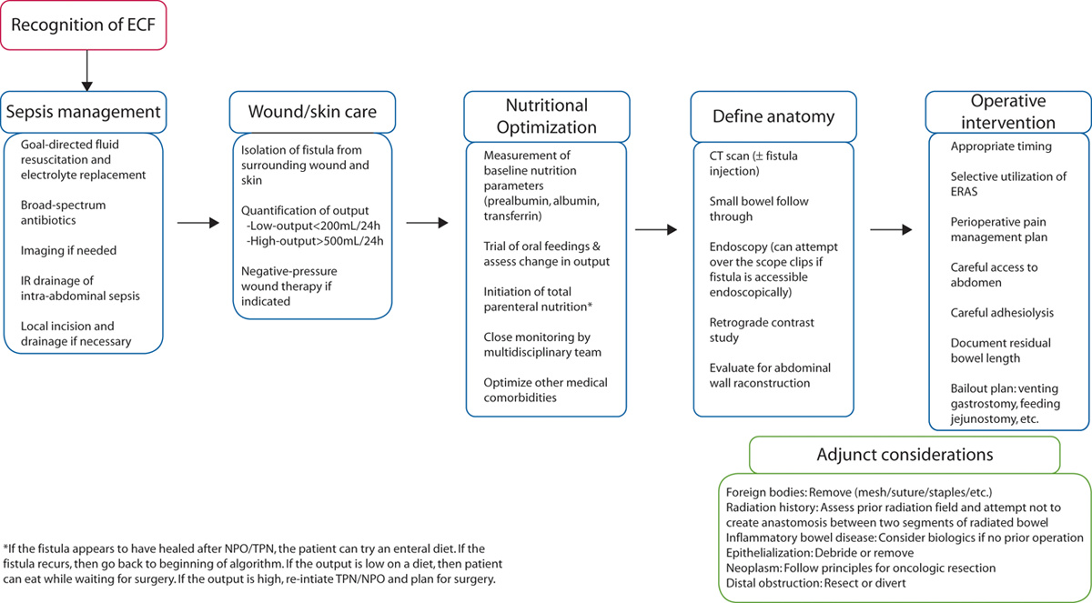 Bhama AR. Evaluation and Management of Enterocutaneous Fistula. Dis Colon Rectum. 2019 Aug;62(8):906-910.