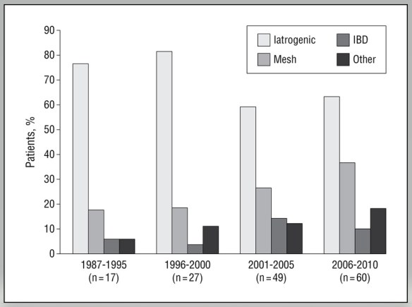 Figure 1. Causes of enterocutaneous fistula between 1987 and 2010. IBD indicates inflammatory bowel disease; other includes radiation, neoplasm, and trauma. Percentages may total more than 100% owing to the fact that some patients’ ECFs were secondary to multiple causes.