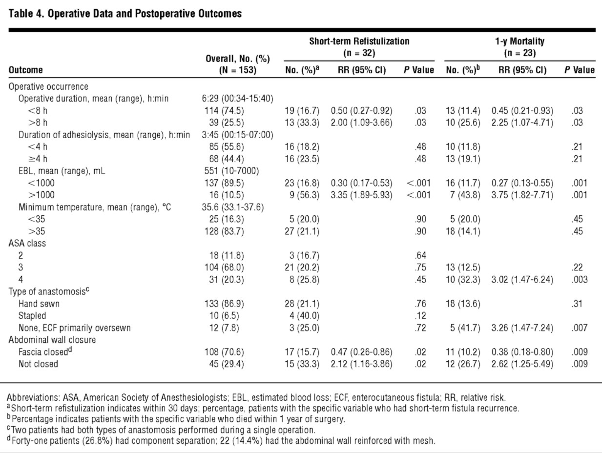 Owen RM, Love TP, Perez SD, Srinivasan JK, Sharma J, Pollock JD, Haack CI, Sweeney JF, Galloway JR. Definitive surgical treatment of enterocutaneous fistula: outcomes of a 23-year experience. JAMA Surg. 2013 Feb;148(2):118-26.