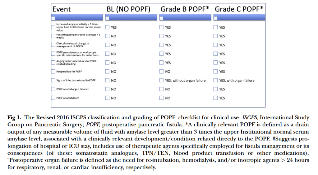 Bassi, Claudio et al. “The 2016 update of the International Study Group (ISGPS) definition and grading of postoperative pancreatic fistula: 11 Years After.” Surgery vol. 161,3 (2017): 584-591. Full Text for Emory Users