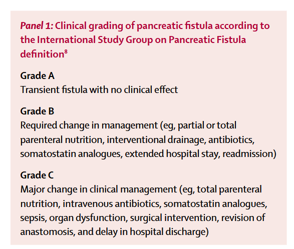 diagnoses. A systematic review supports the evidence that postoperative pancreatic fistula formation represents a major source of postoperative morbidity (13–64%) and is associated with several further complications, such as intra-abdominal abscess, wound infection, sepsis, malabsorption, and haemorrhage.