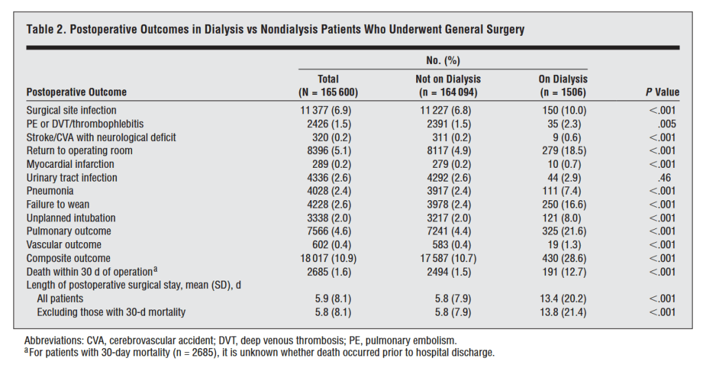 “More than half a million individuals in the United States undergo dialysis, a number that has been forecasted to increase by 7% annually. End-stage renal disease requiring dialysis is associated with poor health care outcomes, including a 10-fold increase in risk of hospitalization and an expected lifespan between one-fourth and one-sixth of that of the general population. Despite the well-described outcomes of the effect of end-stage renal disease on community-dwelling individuals, little is known about the contribution of long-term dialysis to the risks of postoperative complications and death.”