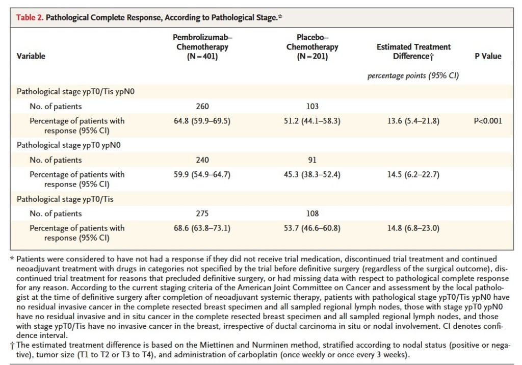 “In this randomized phase 3 trial involving patients with previously untreated, early triple-negative breast cancer, a significantly higher percentage of patients in the pembrolizumab–chemotherapy group than in the placebo–chemotherapy group had a pathological complete response at the time of definitive surgery. The benefit of pembrolizumab–chemotherapy with respect to pathological complete response was generally consistent across subgroups, including PD-L1–expression subgroups. This finding differs from the results of the IMpassion130 trial, which showed efficacy of a PD-L1 inhibitor only in patients with