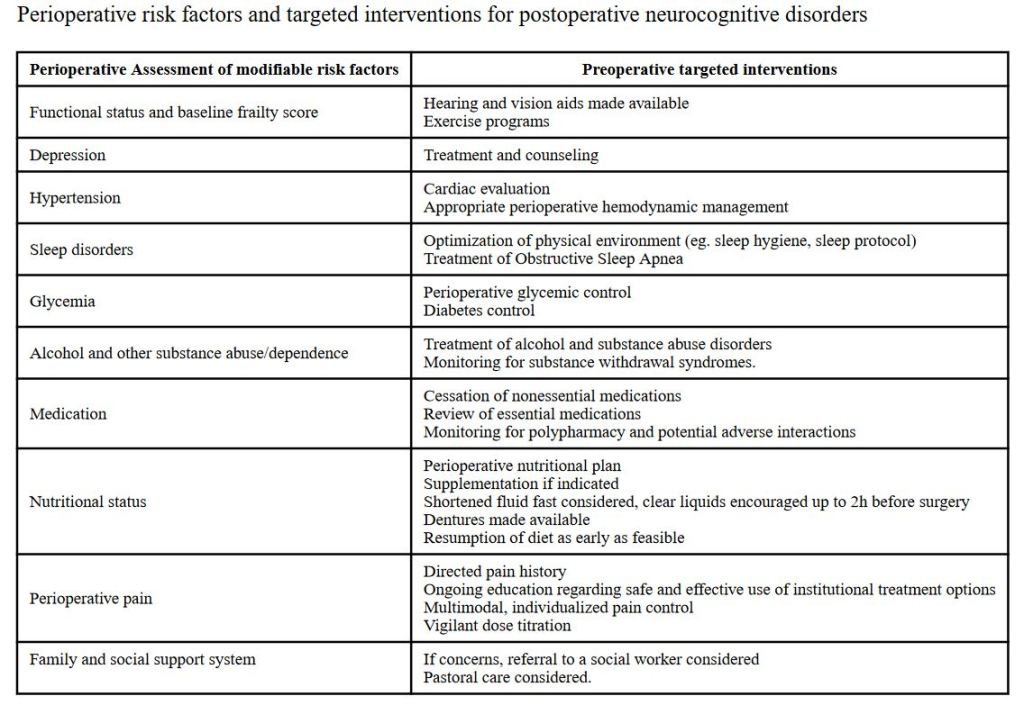“Postoperative neurocognitive decline is a meaningful concern to patients and represents a significant and expanding challenge to health care in the US and worldwide. Surgeons and anesthesiologists should assess, discuss, and optimize associated potential risks for each patient before surgery. Best practices and interventions can begin before surgery and extend well into the recovery period. To be most effective, these strategies require family engagement and the involvement of an interdisciplinary health care team and comprehensive systems of care.” (Vacas)