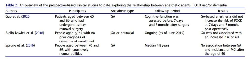 “Although the authors acknowledge that cognitive deterioration following surgery is a common phenomenon, there is little evidence that anesthesia itself or other surgical and patient factors can cause or accelerate cognitive decline and AD. The existing controversy in the field between animal and human studies highlights the need for transitioning from population-based studies to high-quality clinical studies especially with regards to dementia.” (Tsolaki)