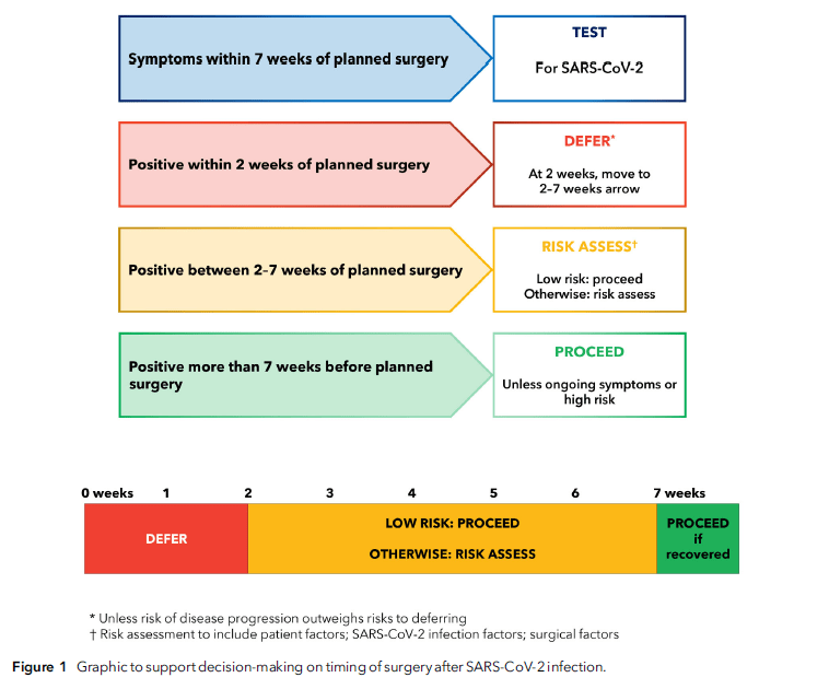 “Patients who develop symptoms of SARS-CoV-2 infection within 7 weeks of planned surgery, including on the day of surgery, should be screened for SARS-CoV-2. Elective surgery should not usually be undertaken within 2 weeks of diagnosis of SARS-CoV-2 infection. For patients who have recovered from SARS-CoV-2 infection and who are low risk or having low-risk surgery, most elective surgery can proceed 2 weeks following a SARS-CoV-2 positive test. For patients who are not low risk or having anything other than low-risk surgery between 2 and 7 weeks following infection, an individual risk assessment must be performed. This should consider: patient factors (age; comorbid and functional status); infection factors (severity; ongoing symptoms; vaccination); and surgical factors (clinical priority; risk of disease progression; grade of surgery).”