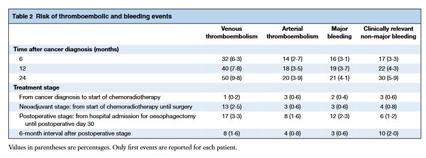 “Patients with oesophageal cancer undergoing neoadjuvant chemoradiotherapy and surgery are at substantial risk of thromboembolic and bleeding events throughout all stages of treatment. Survival is worse in patients with thromboembolic events during follow-up.”