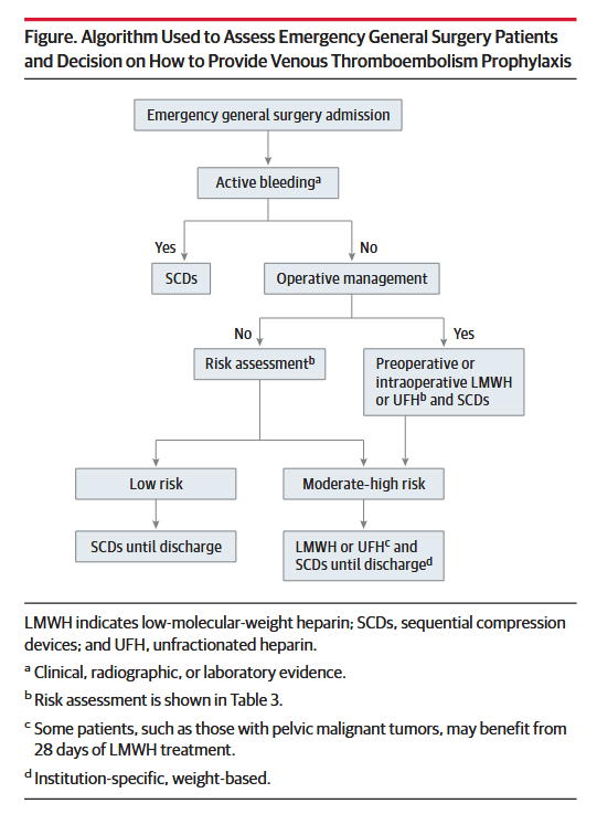 “Venous thromboembolism (VTE) represents the most preventable cause of morbidity and mortality in hospitalized patients, and the Agency for Healthcare Research and Quality (AHRQ) suggests appropriate VTE prophylaxis as a top patient safety practice. The burden of operative and nonoperative emergency general surgery (EGS) is increasing and represents 7% of all hospital admissions in the United States. The reported rate of VTE among patients undergoing EGS is approximately 2.5%. Numerous observational studies, quality improvement studies, randomized clinical trials, reviews, and practice management guidelines are available to guide acute care surgeons in VTE prevention for patients with trauma. However, little guidance is available for the emergency general surgeon. Patients undergoing EGS represent a challenge regarding VTE prevention. Despite the substantial number of annual EGS admissions, little is known about the risk of VTE or the use of mechanical and/or pharmacologic prophylaxis in EGS patients. Furthermore, although guidelines for VTE prophylaxis are available, they are difficult to interpret in the context of admission to an EGS service for an acute condition, particularly when admissions to such services include as many as 70% of patients who do not require operative intervention.”