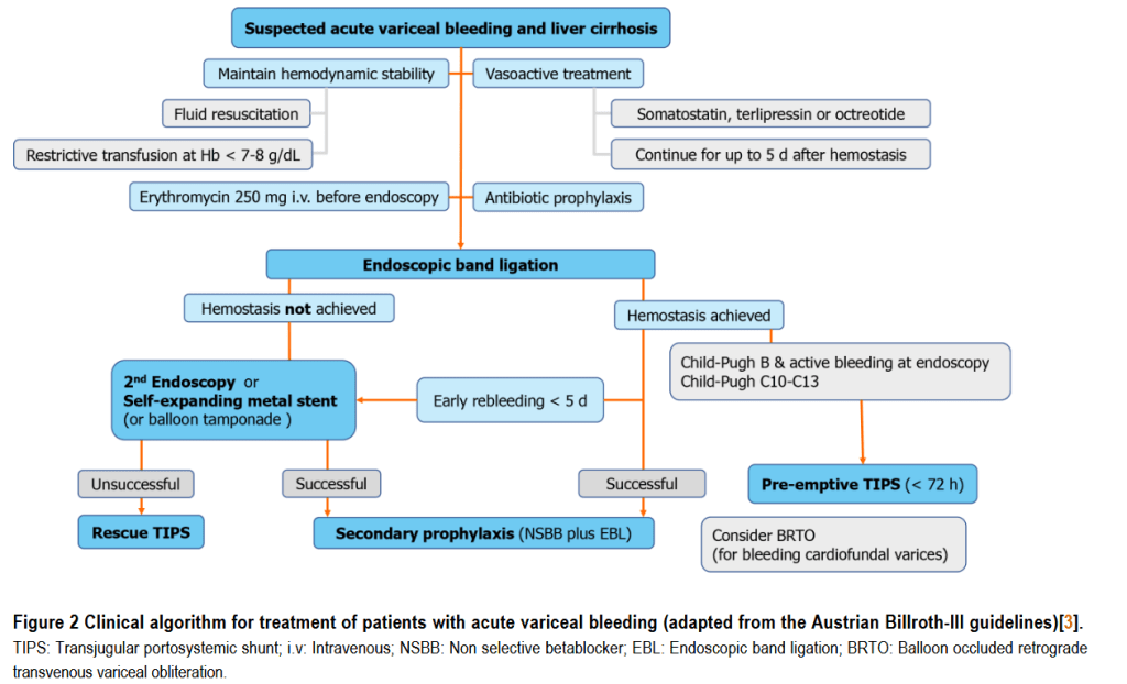 “Variceal bleeding is a severe, and often deadly, complication of portal hypertension. Screening for varices, effective bleeding prophylaxis and standardized management of bleeding is critical to improve clinical outcomes. While carvedilol seems to be the treatment of choice for primary prophylaxis in compensated cirrhosis, the use of hepatic venous pressure gradient measurements and safety of non-selective betablockers in advanced cirrhosis with refractory ascites is controversial. The pre-emptive use of transjugular intrahepatic portosystemic shunt within 72 h after variceal bleeding prevents rebleeding and mortality in Child C10-C13 patients.”