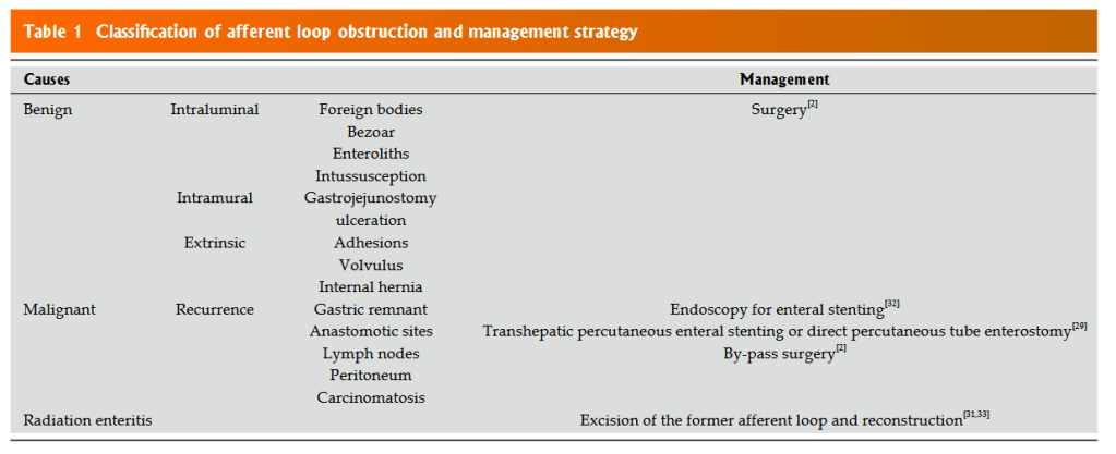“Afferent loop obstruction is a purely mechanical complication that infrequently occurs following construction of a gastrojejunostomy. The operations most commonly associated with this complication are gastrectomy with Billroth II or Roux-en-Y reconstruction, and