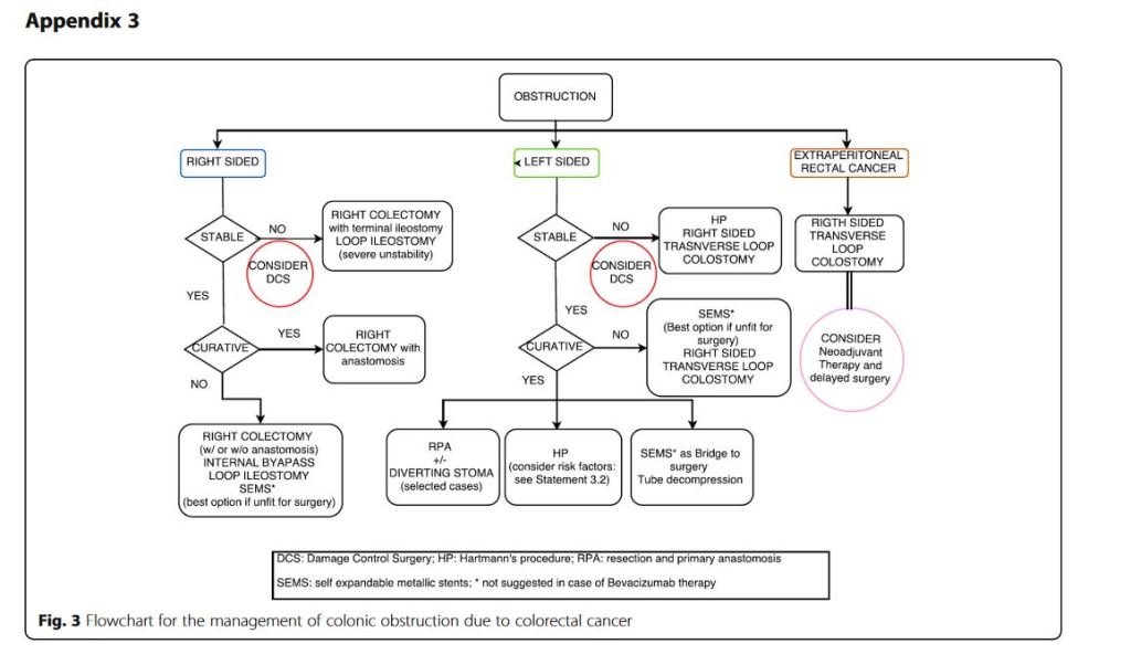 “Obstruction and perforation due to colorectal cancer represent challenging matters in terms of diagnosis, life-saving strategies, obstruction resolution and oncologic challenge. The aims of the current paper are to update the previous WSES guidelines for the management of large bowel perforation and obstructive left colon carcinoma (OLCC) and to develop new guidelines on obstructive right colon carcinoma (ORCC).” “CT scan is the best imaging technique to evaluate large bowel obstruction and perforation. For OLCC, self-expandable metallic stent (SEMS), when available, offers interesting advantages as compared to emergency surgery; however, the positioning of SEMS for surgically treatable causes carries some long-term oncologic disadvantages, which are still under analysis. In the context of emergency surgery, resection and primary anastomosis (RPA) is preferable to Hartmann’s procedure, whenever the characteristics of the patient and the surgeon are permissive. Right-sided loop colostomy is preferable in rectal cancer, when preoperative therapies are predicted. With regards to the treatment of ORCC, right colectomy represents the procedure of choice; alternatives, such as internal bypass and loop ileostomy, are of limited value.”
