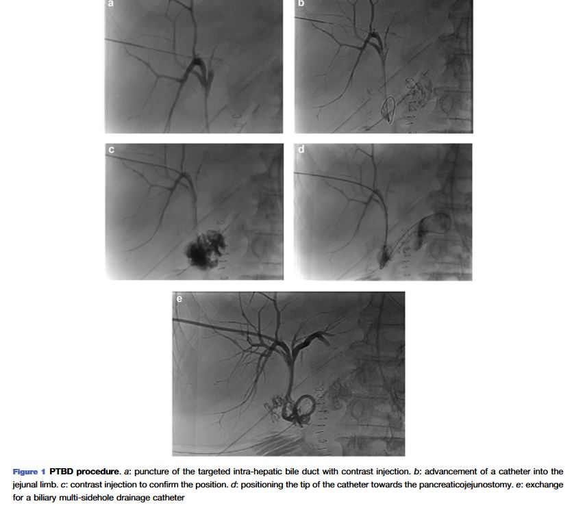 biliary drainage (PTBD) might ameliorate healing of pancreatic fistula and biliary leakage after pancreatoduodenectomy by diversion of bile from the site of leakage. Pancreatoduodenectomy is a complex surgical procedure associated with a high risk of complications (50%), even at specialized high-volume centers. A common complication is leakage of the pancreatic anastomosis: i.e. postoperative pancreatic fistula (POPF). The incidence of clinically relevant POPF (grade B/C) is approximately 12%. A less common complication is bile leakage, with an incidence varying between 1 and 4%.”
