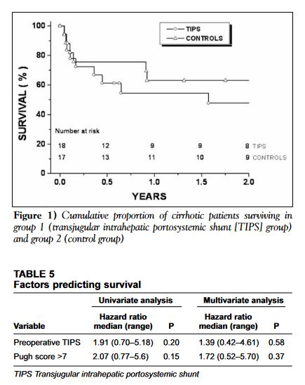 hypertension may be an independent predictor for operative bleeding, postoperative ascites leakage or variceal rupture; this may also influence survival. Transjugular intrahepatic portosystemic shunt (TIPS) placement is much less invasive than surgical shunts and can be performed in patients with a significant degree of liver insufficiency. Therefore, it has been suggested that preoperative TIPS placement may improve the prognosis of cirrhotic patients, submitted to abdominal surgery.”